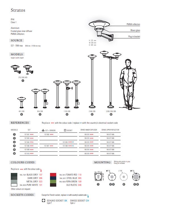 hese luminaires are made of aluminum foundry which allows them to be perfectly adapted to the external environment. They are equipped with a frosted glass diffuser at the bulb. In addition, an opal reflector is placed above the diffuser, it is made of Opal Methacrylate with a special anti-UV treatment that guarantees excellent durability.