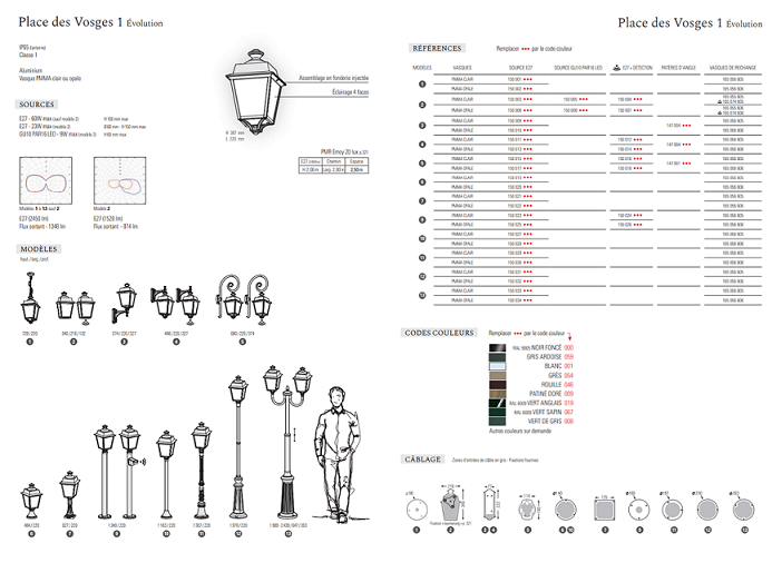The Place des Vosges collection, more than evocative, repeats the familiar lines of the Parisian street lamp, of the early 20th century With its polycarbonate diffuser this lacquered aluminum crest applies a touch of elegance
