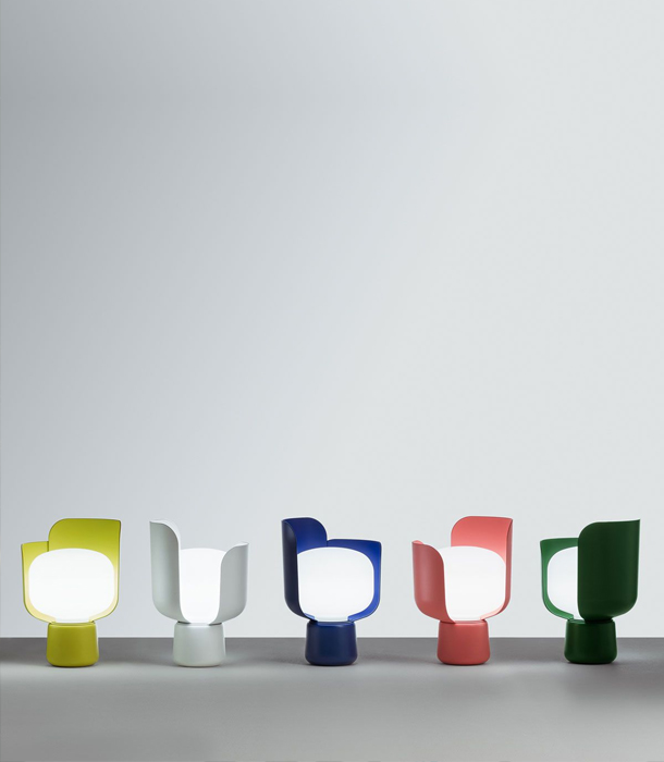 Taking up very little space, just 24 cm tall with a diameter of 15 cm, Blom is a light, fun lamp that is easy to pick up and move and suitable for any purpose. Its name, a contraction of the word blomst, which in Norwegian means flower, is inspired by its petal shaped blades. Intensity can be adjusted thanks to the two petals that gently embrace the diffuser, rotating on the base to shield the glare depending on personal requirements: with the petals aligned the lamp emits maximum light.