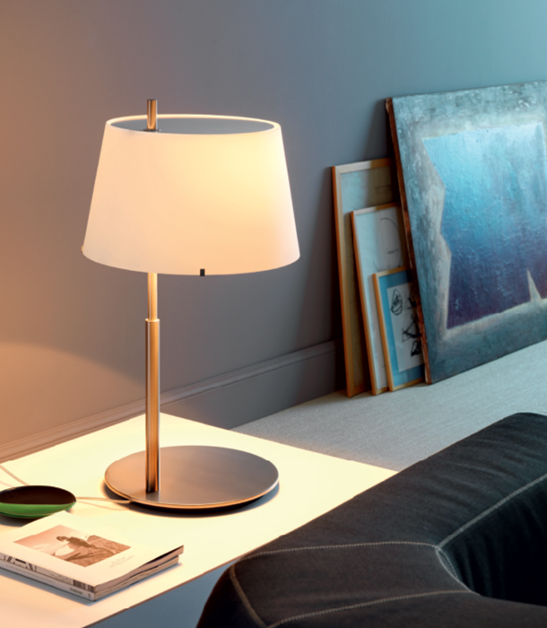 Available in suspension, table, and floor versions. In the latter, the stem is placed off centre on the base.
