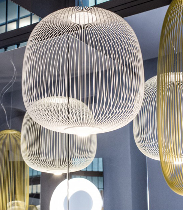 The electric cable that powers the boards is invisible, because it is housed in one of the spokes. The suspension cable is in stainless steel and the electric cable is transparent. The ceiling rose and zinc-coated metal bracket has a shiny white batch dyed ABS covering